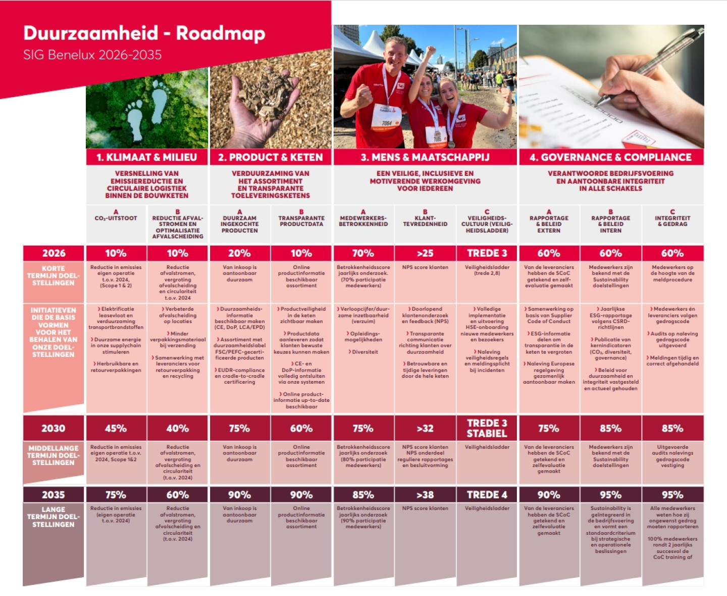 Bij SIG Benelux werken we aan bouwen dat sneller, makkelijker en duurzamer is. Dat begint bij keuzes die we vandaag maken in onze logistiek, ons assortiment, onze mensen en onze keten. Onze Duurzaamheidsroadmap laat zien hoe we stap voor stap werken aan minder uitstoot, meer circulariteit, veilige werkplekken en transparantie in de hele keten.